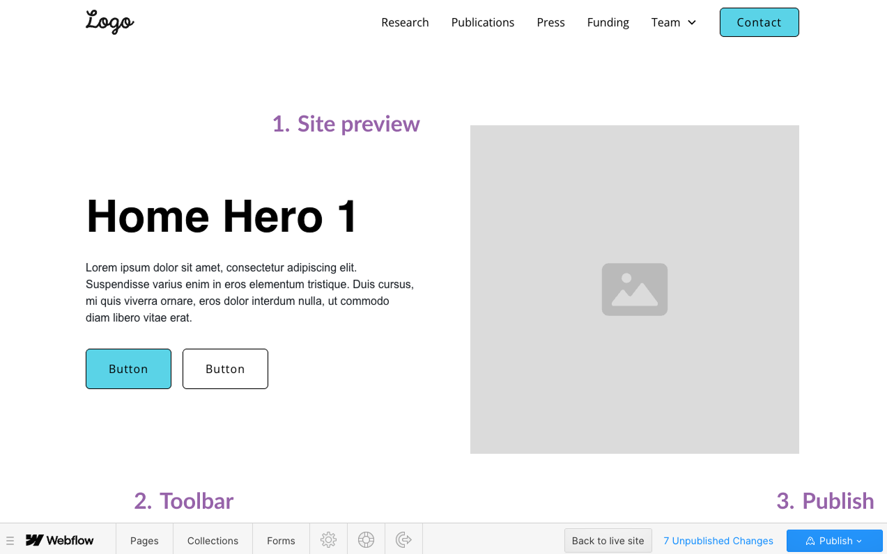 The Webflow Editor is where you’ll make all of your content updates. When you open the Editor, you’ll see a preview of your website along with a few tools that allow you to edit text, swap images, and manage Collection items.